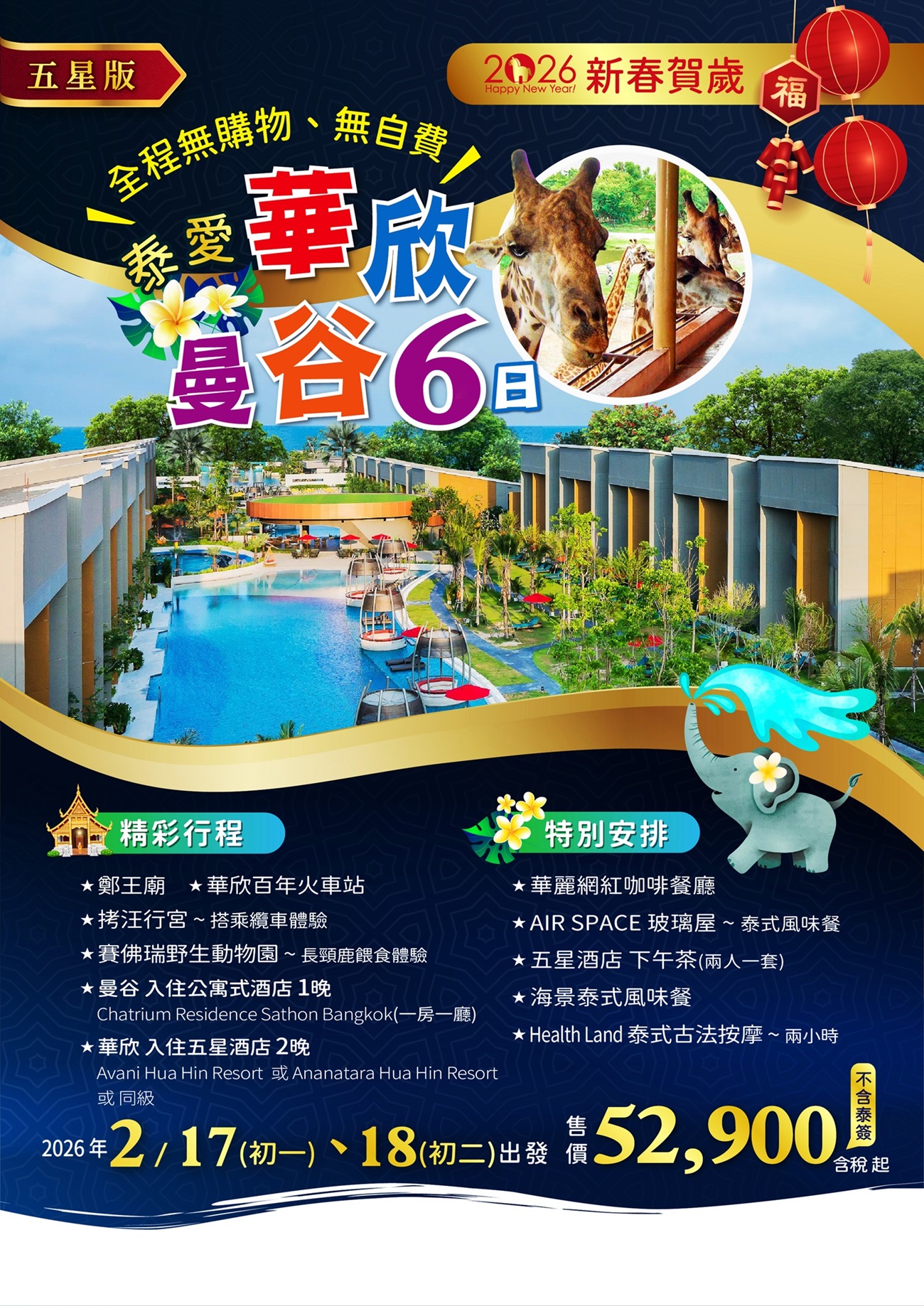 【國泰航空】2026年賀歲~泰愛華欣&曼谷6日(無購物、無自費)-華欣百年火車站、賽福瑞野生動物園、丹能莎朵水上市場