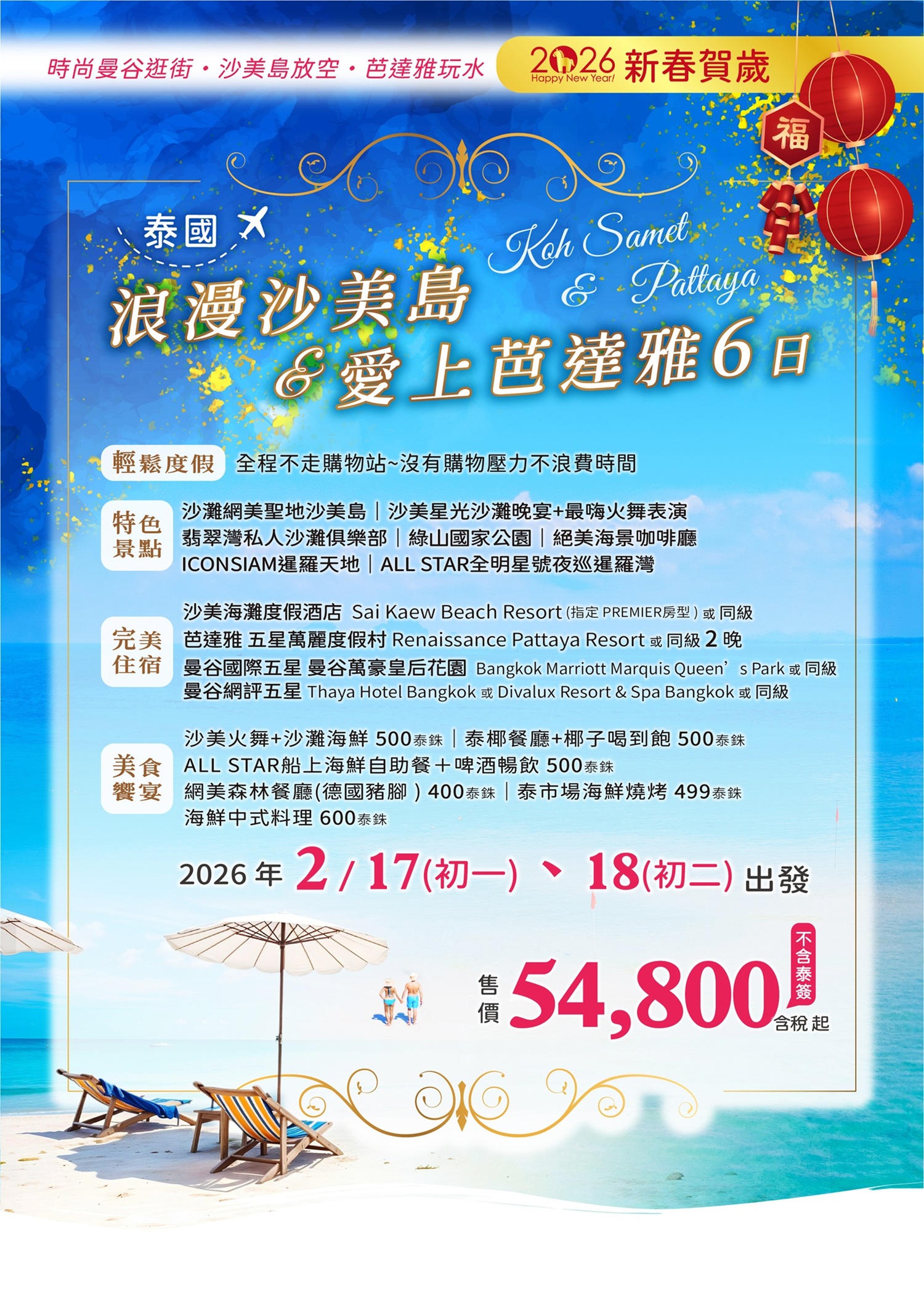 【國泰航空】2026賀歲泰國~浪漫沙美島+愛上芭達雅6日 沙灘網美聖地沙美島、沙灘晚宴+最嗨火舞表演翡翠灣(全程無購物)