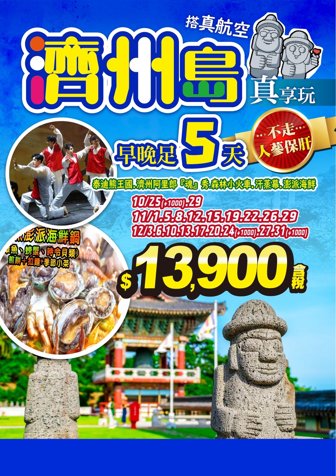 今日於台北桃園國際機場集合後,由專業人員為您辦妥登機手續,搭乘豪華客機直飛東方夏威夷濟州島。