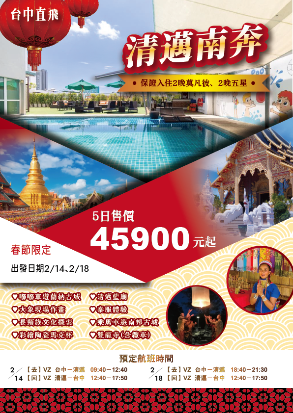 【泰越捷航空】台中直航-清邁+南奔5日(保證入住2晚莫凡彼、2晚五星)大塔寺、雙龍寺、藍廟、小溪吊橋、大象學校