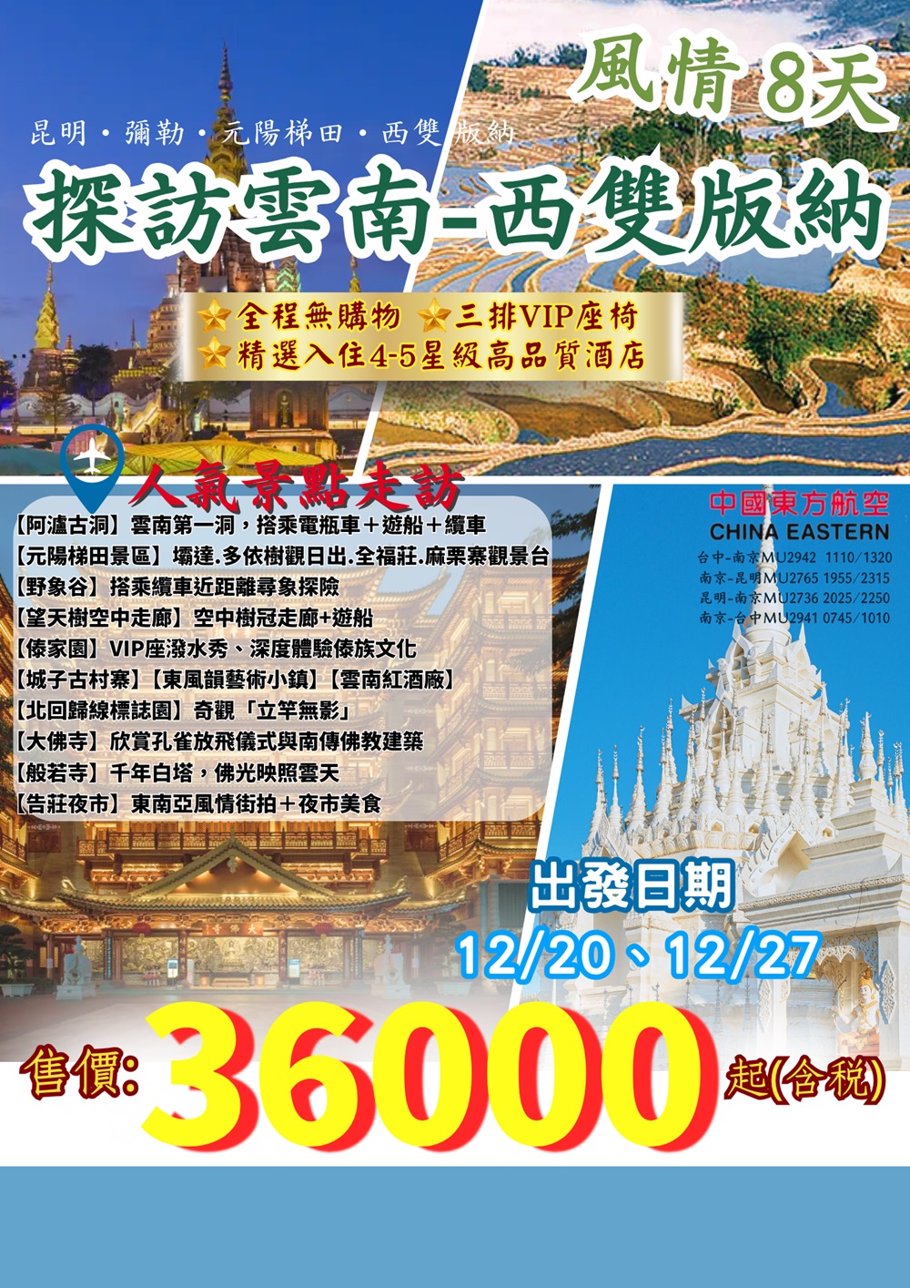 【東方航空-台中出發】昆明.彌勒.元陽梯田.普洱.西雙版納 風情 8天(VIP三排椅+高鐵)