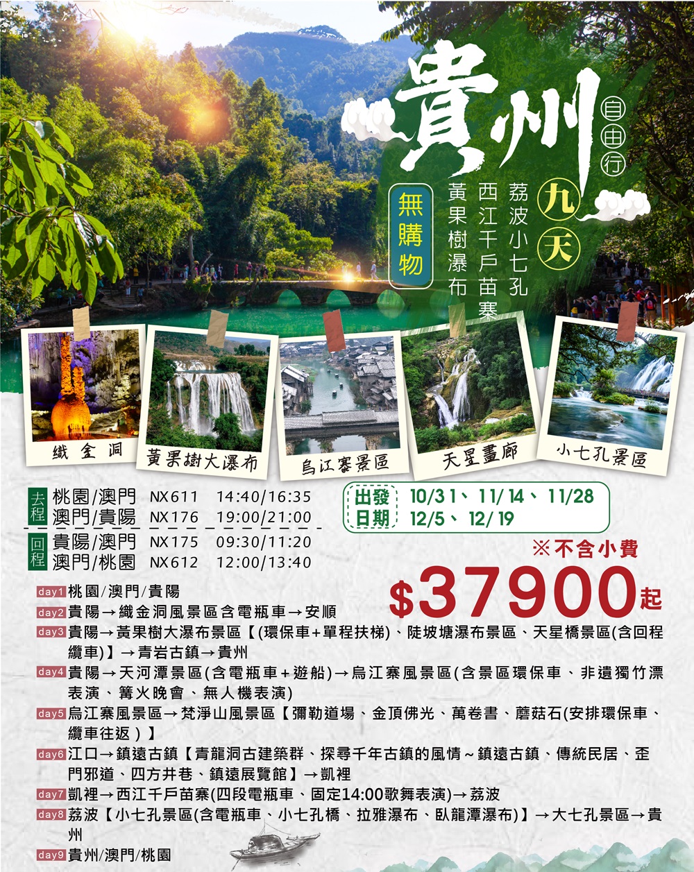 梵淨山.烏江寨.鎮遠古鎮.地球上綠寶石荔波小七孔、西江千戶苗寨、黃果樹瀑布9日遊(貴州段安排三排椅VIP 車)