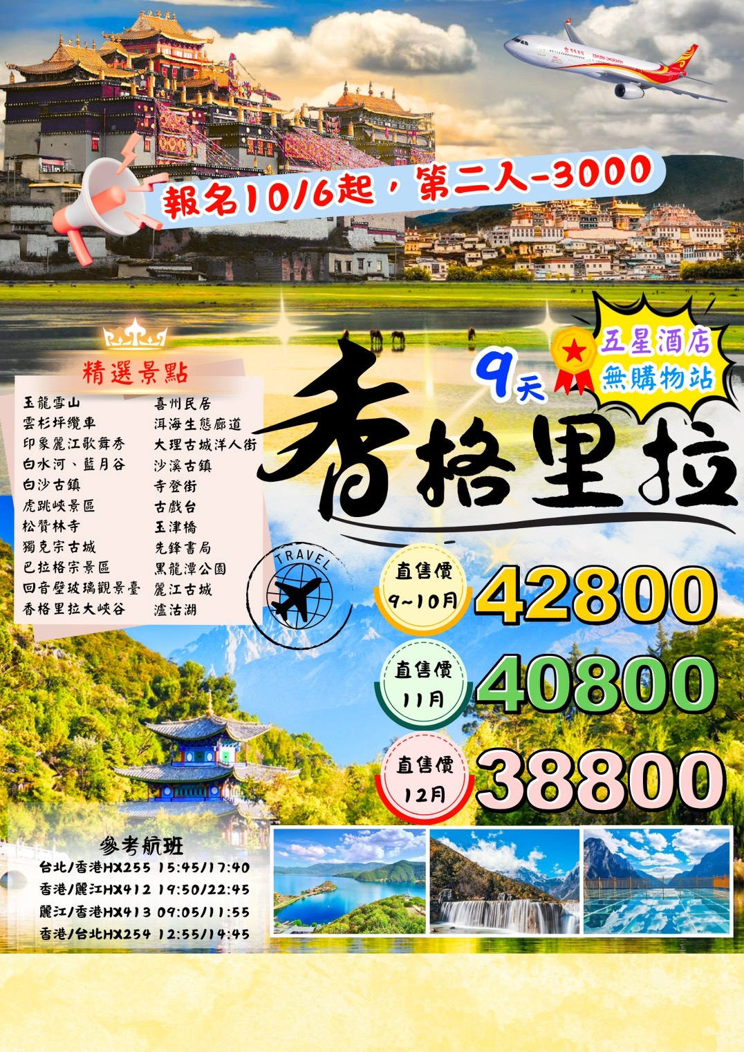 【香港航空】大理、麗江、瀘沽湖、香格里拉9天~白沙古鎮、印象麗江歌舞秀、虎跳峽