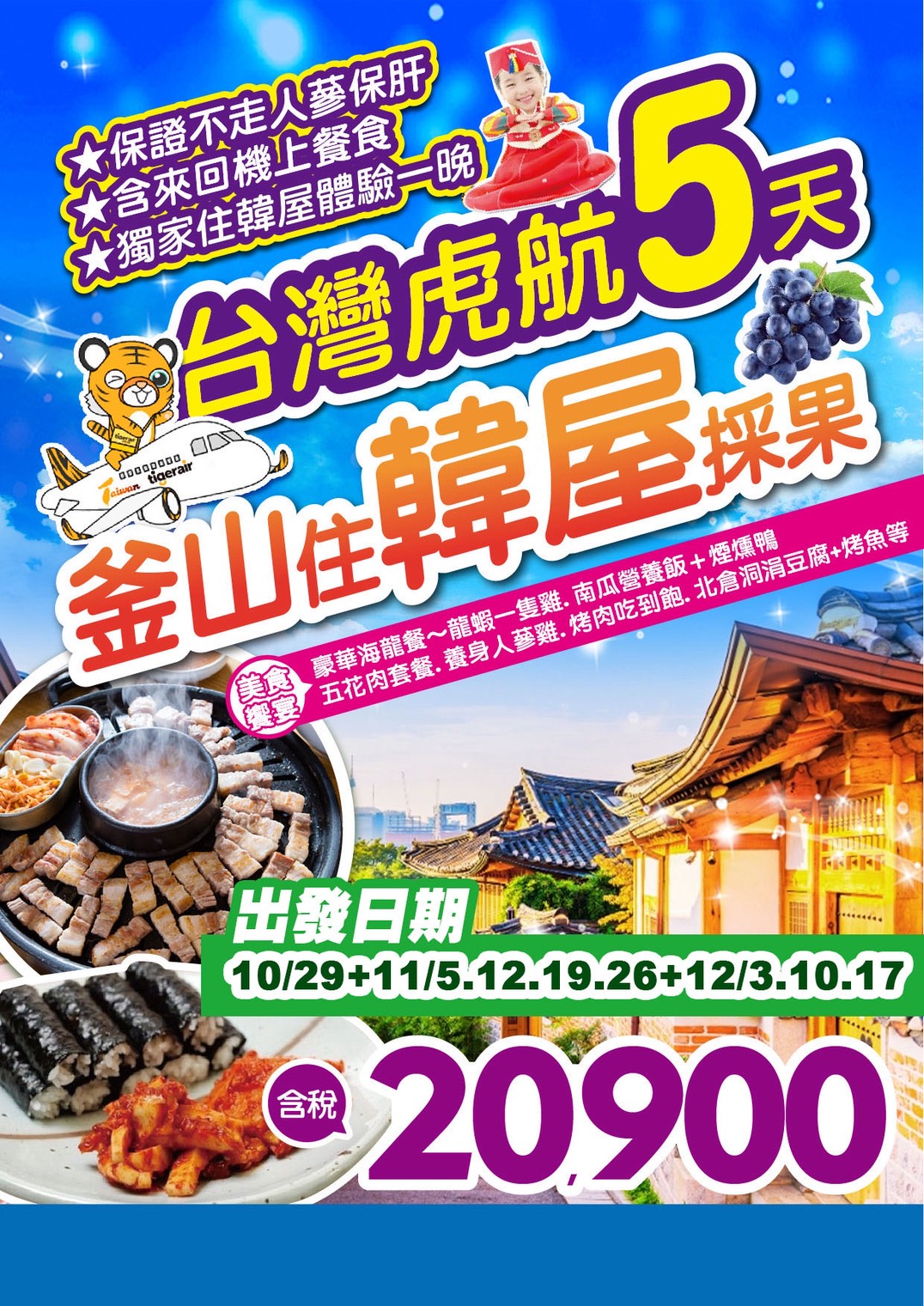 【台灣虎航】《不走人蔘+保肝店》虎力去玩釜山住韓屋採果去5日(獨家入住韓屋體驗一晚)