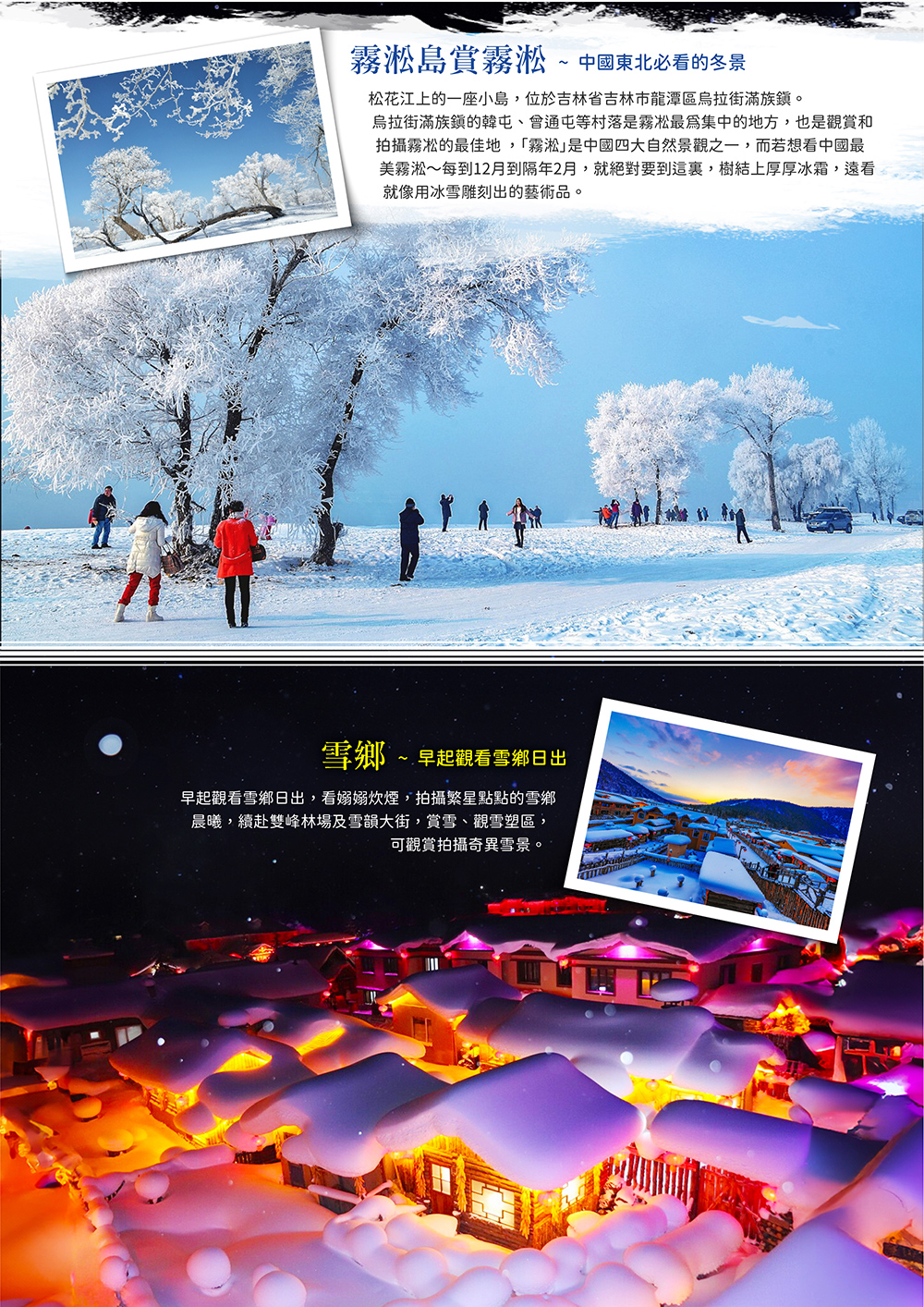 【霧淞島(賞霧淞、視天氣情況而定)】松花江上的一座小島,位於吉林省吉林市龍潭區烏拉街滿族鎮。烏拉街滿族鎮的韓屯、曾通屯等村落是霧凇最為集中的地方,也是觀賞和拍攝霧凇的最佳地 ,「霧淞」是中國四大自然景觀之一,而若想看中國最美霧淞~每到12月到隔年2月,就絕對要到這裏,樹結上厚厚冰霜,遠看就像用冰雪雕刻出的藝術品。是中國東北必看的冬景。