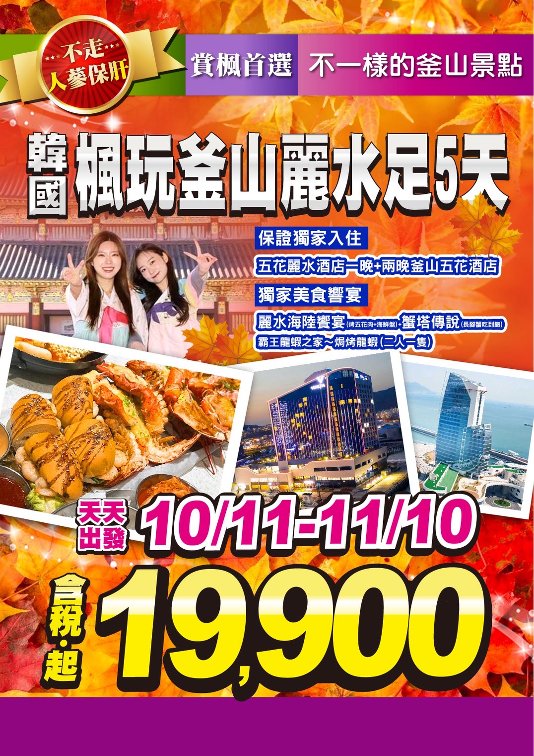 (賞楓日期:10月初~10月底) 註1:賞楓行程會因自然天候狀況而有變化,如因而無法觀賞到楓葉,會依原行程設定前往景點,敬請諒解。 註2:賞楓季節人潮眾多,如遇塞車情況,敬祈鑒諒。