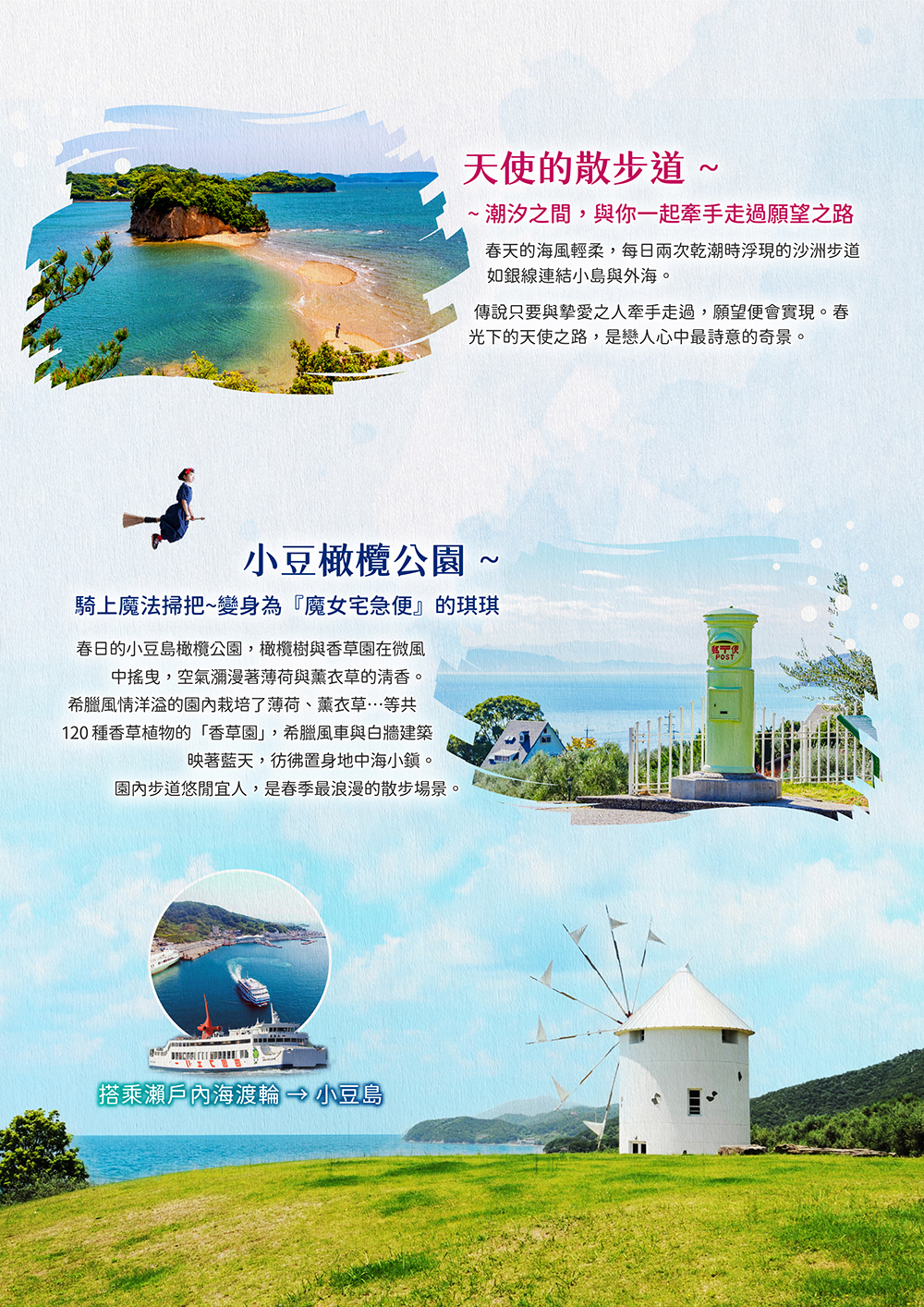 【天使的散步道】 為小豆島超人氣的自然奇景,因海水潮汐之故,每日僅有兩次的乾潮期才會浮現約 500 公尺長的細白色沙洲步道,每日兩次的機會讓陸地與銀波浦內海外灘的小島呈現與海天完美弧線的連結,據說只要與生命中重要之人一起牽手走過就可實現願望的浪漫之地。