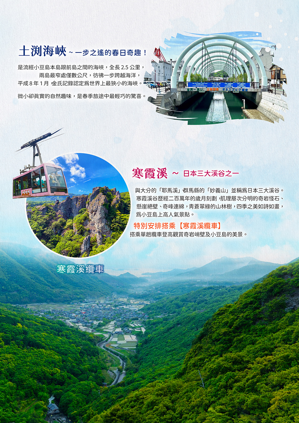※【特別說明】如遇 寒霞溪纜車 不可抗力因素無法安排,則改以巴士上山,並退費團體料金成人 1220 日圓、不佔床兒童 610 日圓 (不含嬰兒)。