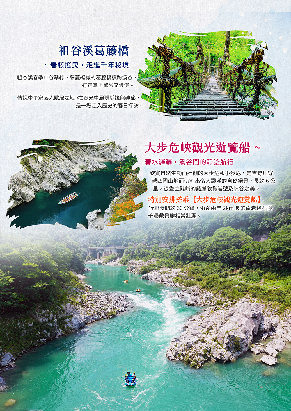 【大步危峽觀光遊覽船】欣賞自然生動而壯觀的大步危和小步危,是吉野川穿越四國山地而切割出令人讚嘆的自然絕景,長約 6 公里,從聳立陡峭的懸崖欣賞岩壁及峽谷之美。特別安排搭乘【大步危峽觀光遊覽船】行船時間約 30 分鐘,沿途兩岸 2km 長的奇岩怪石與千疊敷景勝相當壯麗。