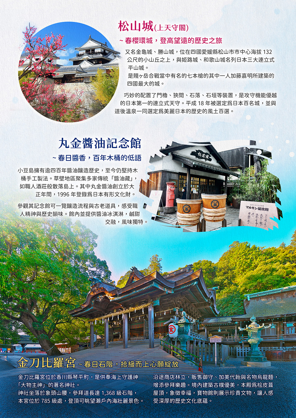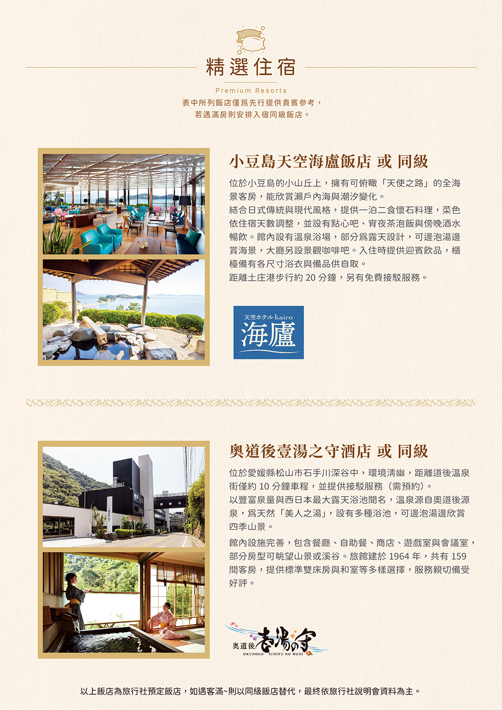 ※【特別說明】如遇 松山城纜車 不可抗力因素無法安排,行程改步行上松山城,並退將退回纜車團體料金成人 500 日圓、不佔床兒童 250 日圓 (不含嬰兒)。