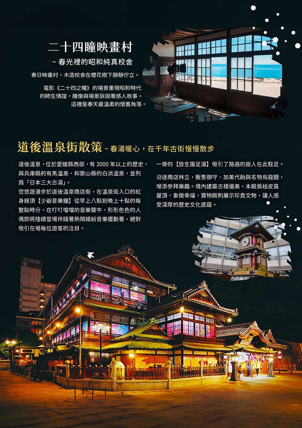【道後溫泉街散策】道後溫泉,位於愛媛縣西部,有 3000 年以上的歷史,與兵庫縣的有馬溫泉、和歌山縣的白浜溫泉,並列為「日本三大古湯」。您悠遊漫步於道後溫泉商店街,在溫泉街入口的紅身綠頂●【少爺音樂鐘】從早上八點到晚上十點的每整點時分,在叮叮噹噹的音樂聲中,形形色色的人偶即將陸續登場伴隨著熱鬧繽紛音樂擺動著,絕對吸引在場每位遊客的注目。一旁的●【放生園足湯】吸引了路過的旅人在此駐足。