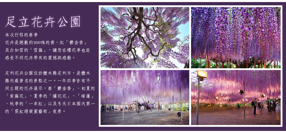 【足利花卉公園~紫藤花〔期預計4/16~5/20〕】最具代表的花卉,屬於多年生藤蔓植物,莖具纏繞性,直徑達10公分以上,常被用作棚架觀賞植物,花狀花序側生在枝端,20~30朵紫色小花整齊排列,開花時蝶形花朵成串下垂,長度可達15~30公分,花量大時彷彿紫色瀑布,美得令人屏息。公園裡的紫藤約300棵,每逢盛開時聲勢驚人,被公認是全世界最漂亮的紫藤花美景。