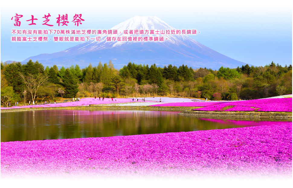 【富士芝櫻祭〔預計開放時間4/16~5/29〕】在兩萬四千平方公尺的栽植面積裡,廣大的粉紅色美景映入您的眼簾,粉紅春色、新綠蒼林及雄偉富士山為背景之下,70萬株的芝櫻以龍型為構圖的在龍神池畔盤踞成一條巨龍,巧妙配置濃淡不一的紅、粉紅、白色的花朵相間隔成紅龍身上一條條美麗的紋路,芝櫻編織成的花彩圖騰就如絨毯般熱鬧的在大地展開來,芝櫻被稱為『開花地被』花朵貌似櫻花但比櫻花細小,共有紫、白、紅、粉紅、淡粉、雪青各種花色,花密集而鮮豔,朵朵小花形成大片花被,聞起來略有花香。