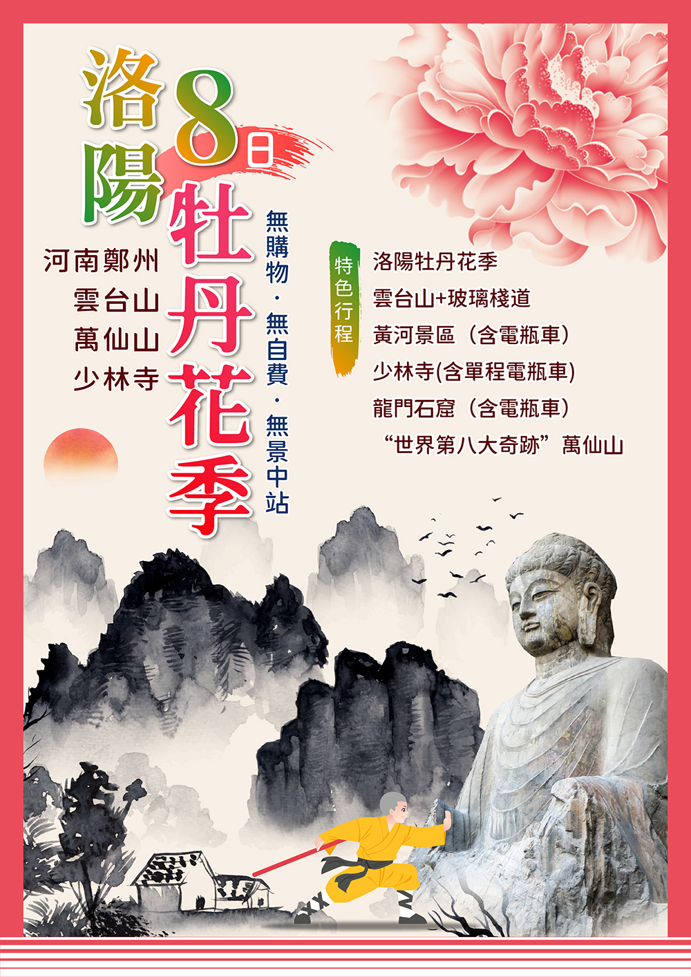 洛陽牡丹花季~河南鄭州.雲台山+萬仙山.少林寺無購物八日