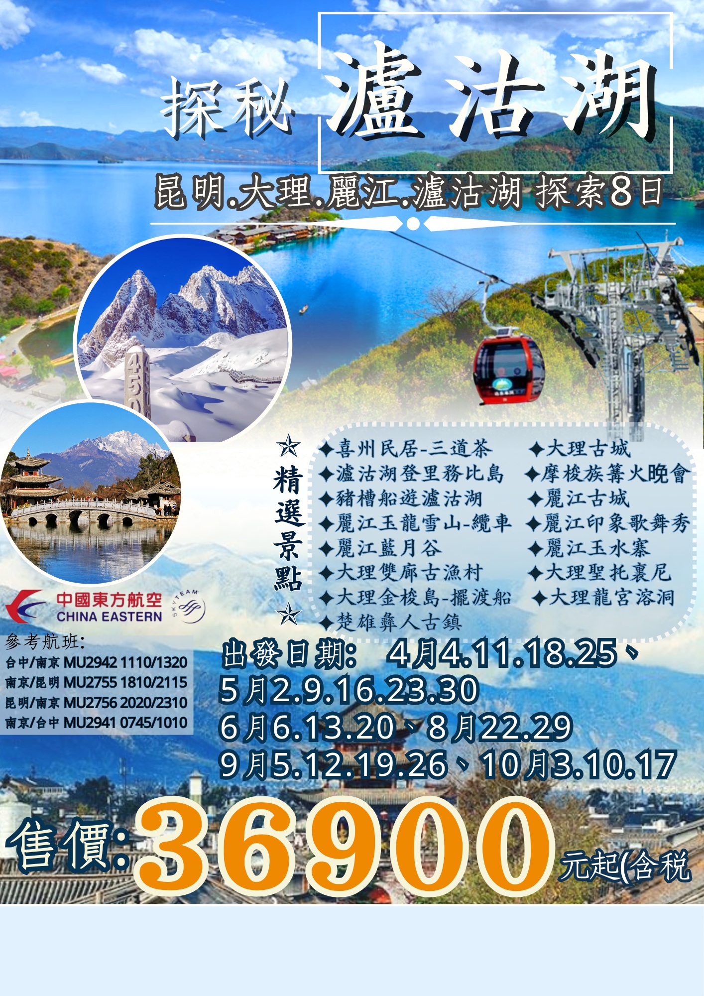 【東方航空-台中出發】昆明.大理.瀘沽湖風情8天~麗江~楚雄~南京~