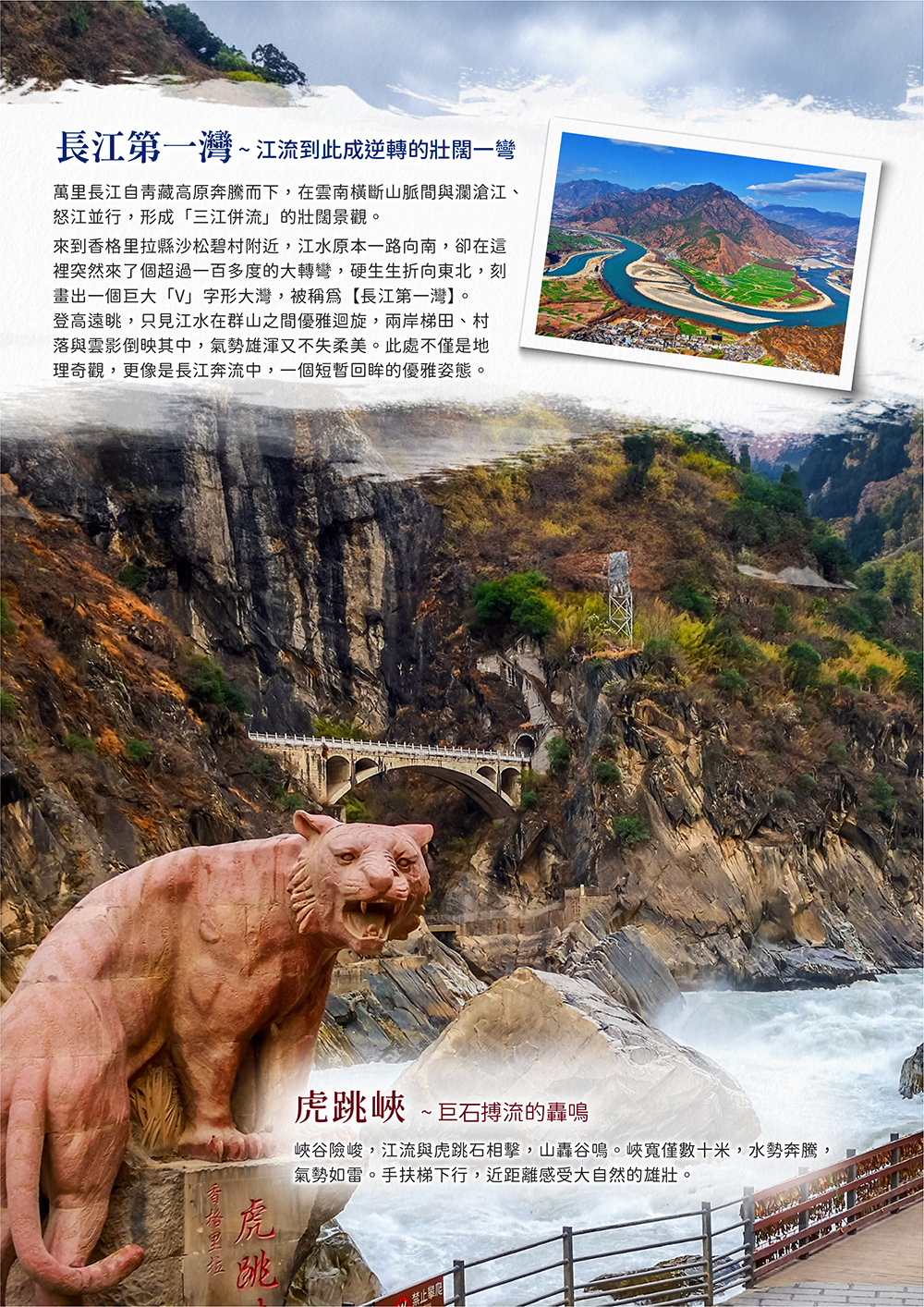 【虎跳峽】,是世界上著名的大峽谷,以奇險雄壯著稱于世。從虎跳 峽鎮過沖江河洞哈巴雪山山麓順江而下,即可進入峽谷。上虎跳距虎跳峽鎮9公里,是整 個峽谷中最窄的一段,峽寬僅叨余米,江心右一個13米高的大石一虎跳石,巨石猶如孤峰突起,屹然獨尊,江流與巨石相互搏擊,山轟谷鳴,氣勢非凡。隨後遠眺【長江第一灣】這秀麗的江川。萬里長江從“世界屋脊”——青藏高原奔騰而下,巴塘縣城境內進入雲南,與瀾滄江、怒江一起在橫斷山脈的高山深谷中穿行形成了“三江併流”的壯麗景觀。到了香格里拉縣的沙松碧村,突然來了個100多度的急轉彎,轉向東北,形成了罕見的"V"字形大彎,“江流到此成逆轉,奔入中原壯大觀”,人們稱這天下奇觀為“長江第一灣”。