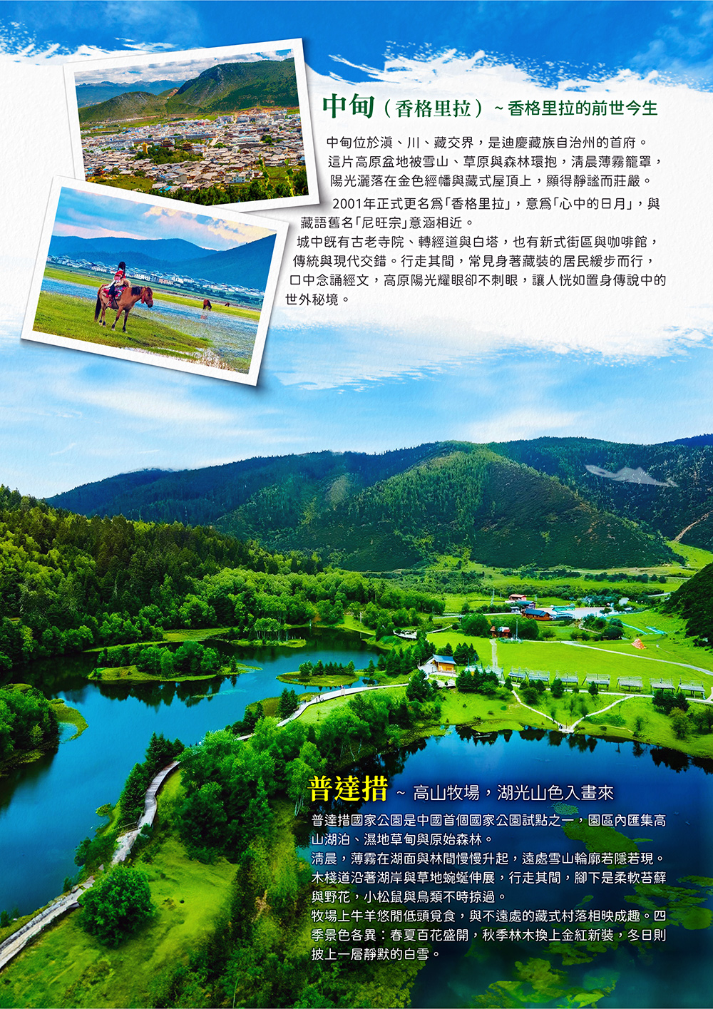 隨後專車前往香格里拉迪慶州首府-【中甸】,是雲南迪慶藏族自治州首府,位於滇、川、藏三省區交界處。2001年12月17日經中華人民共和國國務院民政部批准,正式易名為“香格里拉縣”,是雲南省迪慶藏族自治州首府所在地。香格里拉的含義與中甸縣古城藏語地名“尼旺宗”相一致。