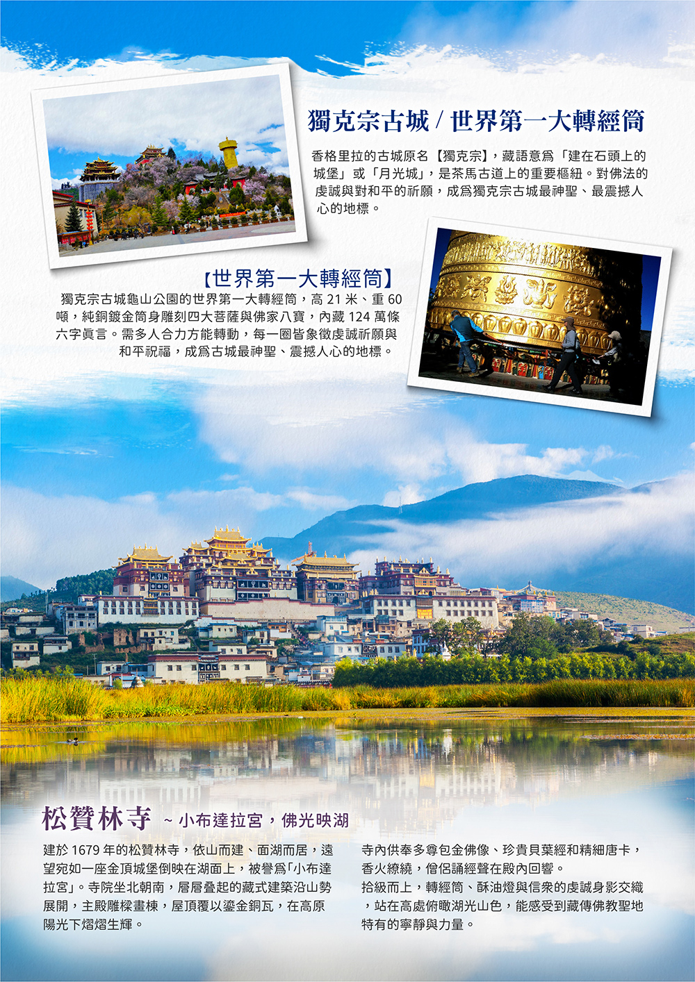 【松贊林寺】建於1679年,依山而建,面湖而居,氣勢恢弘,莊嚴神秘,是雲南藏傳佛教的首要寺廟。為該寺選址時,達剌喇嘛占卜得神示:“林木深幽現清泉,天降金鶩戲其間”。現在的松贊林寺內有清泉淙淙,春夏不溢,秋冬不涸,並能常見一對金鶩出入。松贊林寺坐北朝南,外圍築有橢圓形城垣,扎倉、吉康兩大主殿位於寺中心的最高點。大殿為五層藏式建築,雕樑畫棟,頂部為鎏金銅質金頂,金碧輝煌。不僅建築精美,寺內所藏宗教法器及珍貴文物也頗多。其中有五世達賴和七世達賴時期的八尊包金釋迦佛像、貝葉經、五彩金汁精繪唐卡、黃金燈和《丹珠爾》經書十部,其中兩部為金汁手書,極其珍貴。