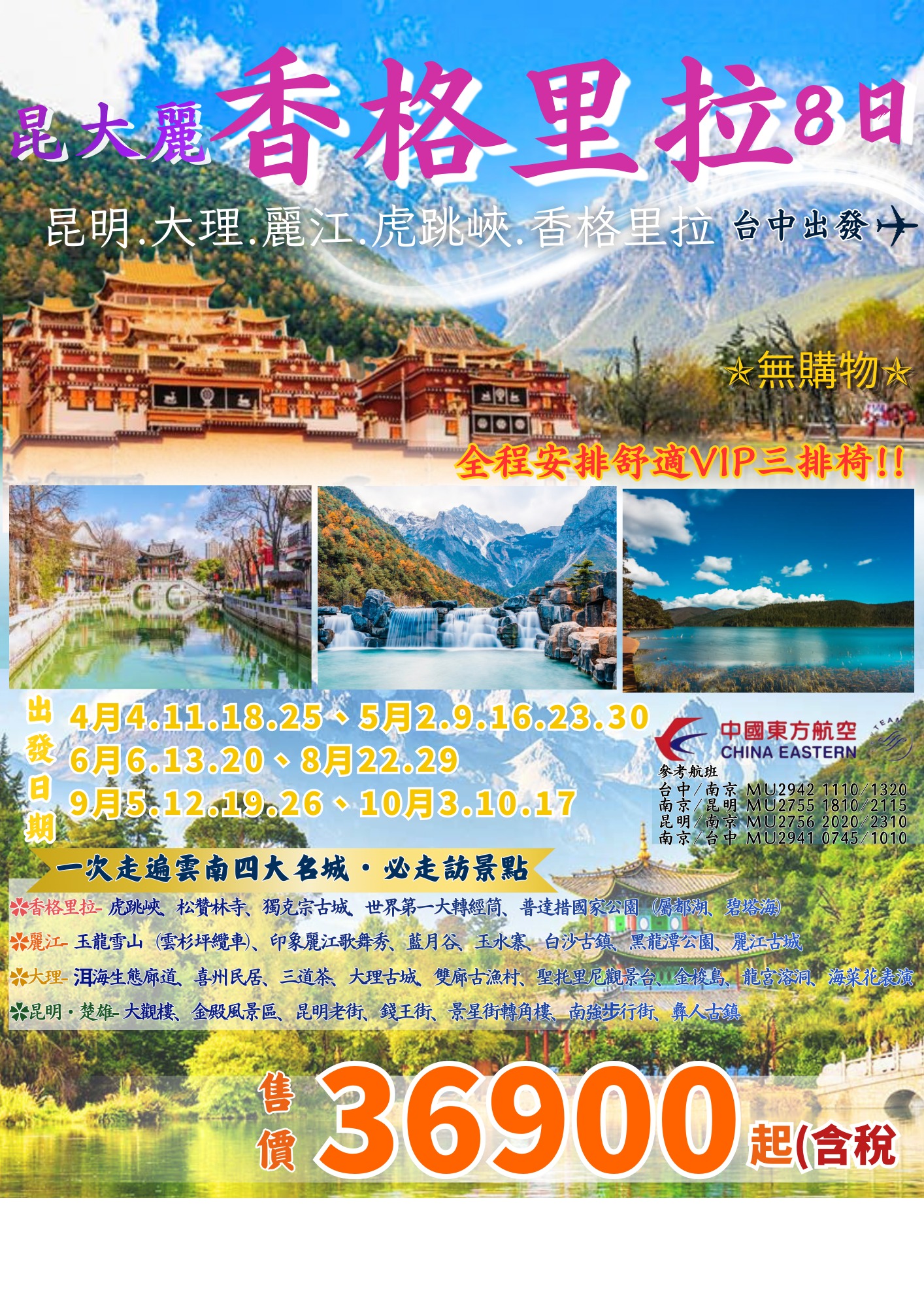 【東方航空-台中出發】昆明.大理.麗江風情8天~虎跳峽~香格里拉~南京~