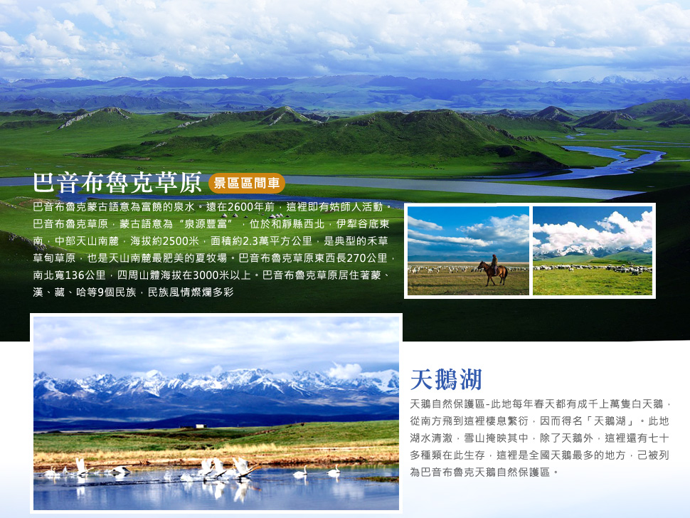 【巴音布魯克草原】巴音布魯克蒙古語意為“富饒的泉水”。遠在2600年前,這裡即有姑師人活動。巴音布魯克草原,蒙古語意為“泉源豐富”,位於和靜縣西北,伊犁谷底東南,中部天山南麓,海拔約2500米,面積約2.3萬平方公里,是典型的禾草草甸草原,也是天山南麓最肥美的夏牧場。巴音布魯克草原居住著蒙、漢、藏、哈等9個民族,民族風情燦爛多彩,續前往【天鵝自然保護區】此地每年春天都有成千上萬隻白天鵝,從南方飛到這裡棲息繁衍,因而得名「天鵝湖」。此地湖水清澈,雪山掩映其中,除了天鵝外,這裡還有七十多種類在此生存,這裡是全國天鵝最多的地方,己被列為巴音布魯克天鵝自然保護區。