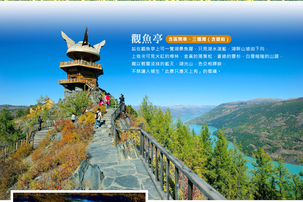 【觀魚亭】,站在觀魚亭上可一覽湖景魚躍,只見湖水湛藍,湖畔山坡由下向,上依次可見火紅的樺林,金黃的落葉松,蒼綠的雲杉,白雪皚皚的山頭,襯以輕雲淡抹的藍天,湖光山,色交相暉映,不禁讓人頓生「此景只應天上有」的慨嘆。乘船遊覽【三道灣】三道灣那裏是喀納斯湖最深處,是傳說中“湖怪”出沒的地方,據科學家們判斷,所謂的“湖怪”是一種名為哲羅鮭的大紅魚,上了遊船,坐在船上看兩岸,感受的確又有不同。視野變得開闊起來,湖面非常寬闊,有陣陣涼風吹來,兩岸的山巒此時顯得高大起來,天邊的雲一朵一朵懸掛在湖的上方,岸邊圖瓦人家的小木屋顯得那麼地靜謐。喀納斯湖,就像一幅立體的油畫,當你置身其中,一轉身一回眸,一幅幅優美的油畫畫面就映入眼簾。