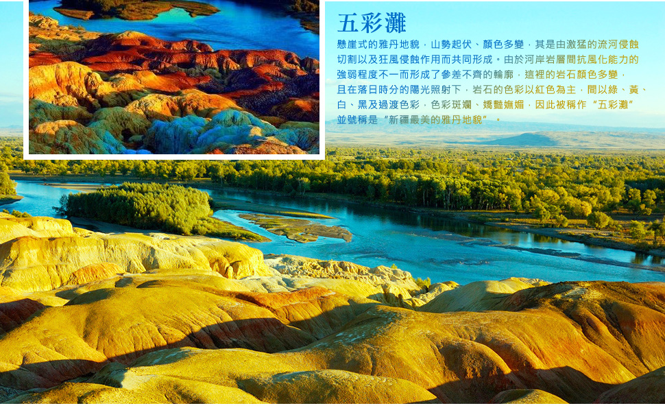 【五彩灘】五彩灘是懸崖式的雅丹地貌,山勢起伏、顏色多變,其是由激猛的流河侵蝕切割以及狂風侵蝕作用而共同形成。由於河岸岩層間抗風化能力的強弱程度不一而形成了參差不齊的輪廓,這裡的岩石顏色多變,且在落日時分的陽光照射下,岩石的色彩以紅色為主,間以綠、黃、白、黑及過渡色彩,色彩斑斕、嬌豔嫵媚,因此被稱作“五彩灘”並號稱是“新疆最美的雅丹地貌”。