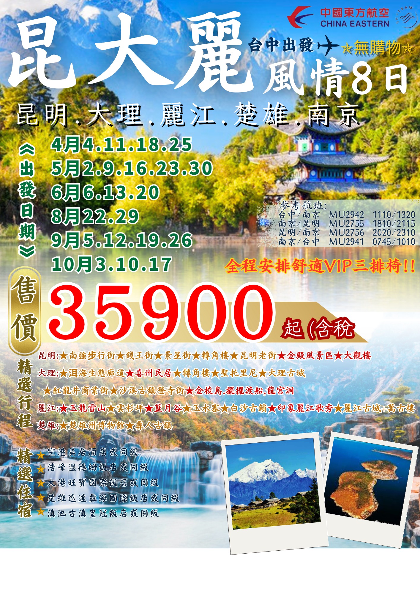 【東方航空-台中出發】昆明.大理.麗江.南京尊貴8天(全程安排VIP三排椅)